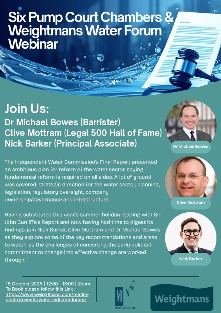 Join leading legal minds Dr Michael Bowes (Barrister), Clive Mottram, Weightmans (Legal 500 Hall of Fame), and Nick Barker , Weightmans (Principal Associate) for a timely and insightful discussion on the future of the UK water sector, following the release of the Independent Water Commission’s Final Report.